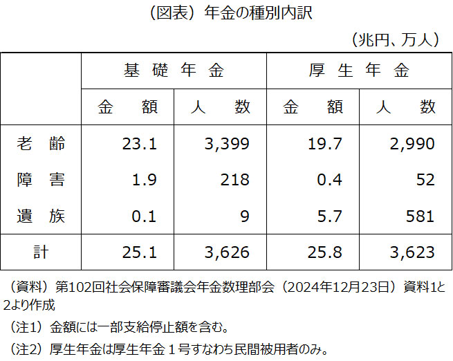 第二のリスクは、一家の働き手を失うリスク(遺族になるリスク)です。年金の加入者が亡くなった際、残された家族に支給されるのが「遺族年金」です。厚生年金保険加入者の夫が亡くなった場合、夫の報酬比例部分の4分の3が給付されます。厚生年金保険の給付費総額25.8兆円のうち遺族年金は5.7兆円で受給者は約581万人です(図表)。厚生年金保険の遺族年金は比較的手厚いと言えるでしょう。他方、国民年金制度加入者の夫が亡くなった場合、18歳以下の子どもがいることが遺族基礎年金の受給条件となっており 、対象者数は限られます。実際、遺族基礎年金の受給者は約9万人、総額0.1兆円に過ぎません。夫婦ともに基礎年金で生活しているケースでは、どちらかが亡くなると年金受給額が半分になるため、高齢者の貧困の原因になっています。
