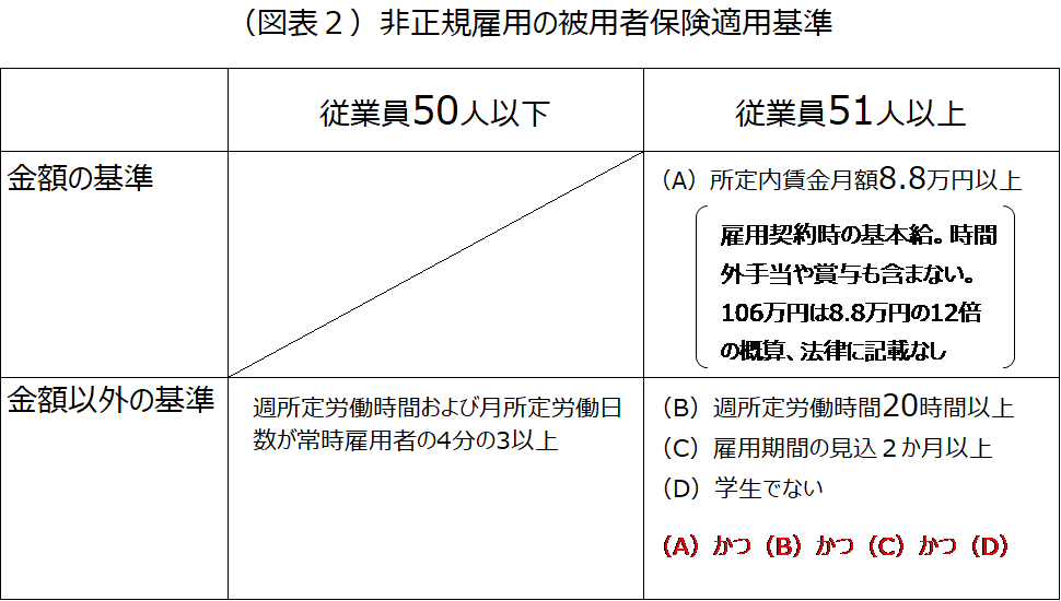 従って、例えば、週所定内賃金が8.8万円以上であっても、週所定労働時間が20時間未満であれば第2号被保険者とはなりません。8.8万円に12をかけ1年分に換算すると105.6万円です。しばしば耳にする「106万円」は、これを丸めて慣例的に用いられている数字です。106万円は、年収の壁の1つとして認識されているようですが、年収が106万円を超えても、(B)が未充足、すなわち、週所定労働時間が20時間未満であれば、第2号被保険者とはなりません。