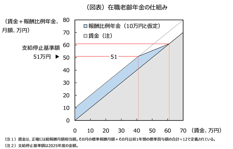 報酬比例年金と賃金の合計額が51万円を超えると、報酬比例年金は超過額の2分の1が削減されます。この51万円を支給停止基準額、こうした仕組みを在職老齢年金といいます。例えば、報酬比例年金が月額10万円であるとした場合、賃金が41万円を超えると、報酬比例年金は削減されはじめ、賃金が61万円になると報酬比例年金はゼロになります(図表)。なお、基礎年金はこの仕組みの対象とはなりません。
