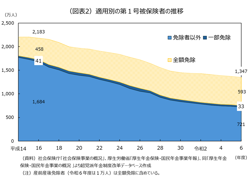 こうした努力があるとはいえ、よりよい年金制度を追求する観点から、この納付率は割り引いて見る必要もあります。第1号被保険者には、保険料の全額免除と一部免除*2 の仕組みがあり、納付率はおおまかにいえば全額免除を除いたあとの被保険者を対象に計算されているためです。20年前の平成16年度(2004年度)には、第1号被保険者は2,183万人おり、そのうち全額免除は458万人でした(図表2)。おおよそ5人に1人の割合です。ところが、令和6年度(2024年度)、第1号被保険者は1,347万人に減っているものの、全額免除はむしろ増加し593万人に達しています。おおよそ5人に2人の割合です。