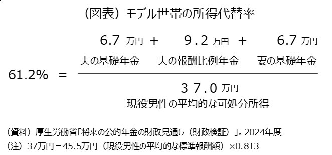 第1に、分母は1人分であるのに対し、分子は2人分となっていることです。具体的には、分母は、現役男性の平均的な可処分所得37万円とされています(図表)。他方、分子の年金額は第2号被保険者の夫の基礎年金6.7万円と報酬比例年金9.2万円、および、第3号被保険者の妻の基礎年金6.7万円の計22.6万円とされています。こうした世帯はモデル世帯と呼ばれています 。したがって、単身世帯、夫婦共働き世帯、および、基礎年金のみの受給者にはこの定義はあてはまりません。