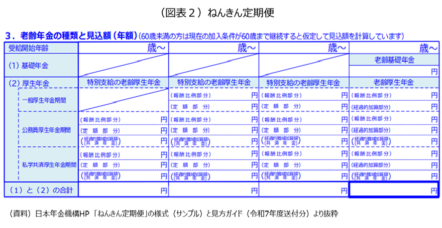 A4 その通りです。例えば、厚生労働省HPの「お知らせ」では令和8年度の厚生年金は237,279円とされていますが、これもモデル世帯のものです。このなかに含まれる報酬比例年金額を知るためには、ここから基礎年金2人分を控除しなければなりません。他方、日本年金機構から送られてくる「ねんきん定期便」は、1人ひとりに宛てたものであり、当然ながら老齢基礎年金と老齢厚生年金(報酬比例部分)に分けて表記されています。モデル世帯の定義は、年金財政の健全性を測るための定点観測の指標として残すとしても、国民向けには用いるべきではないでしょう。